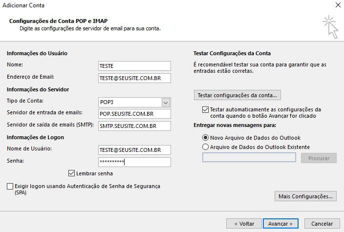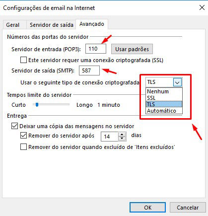 - Na opção Servidor de entrada (POP3) use a porta 110